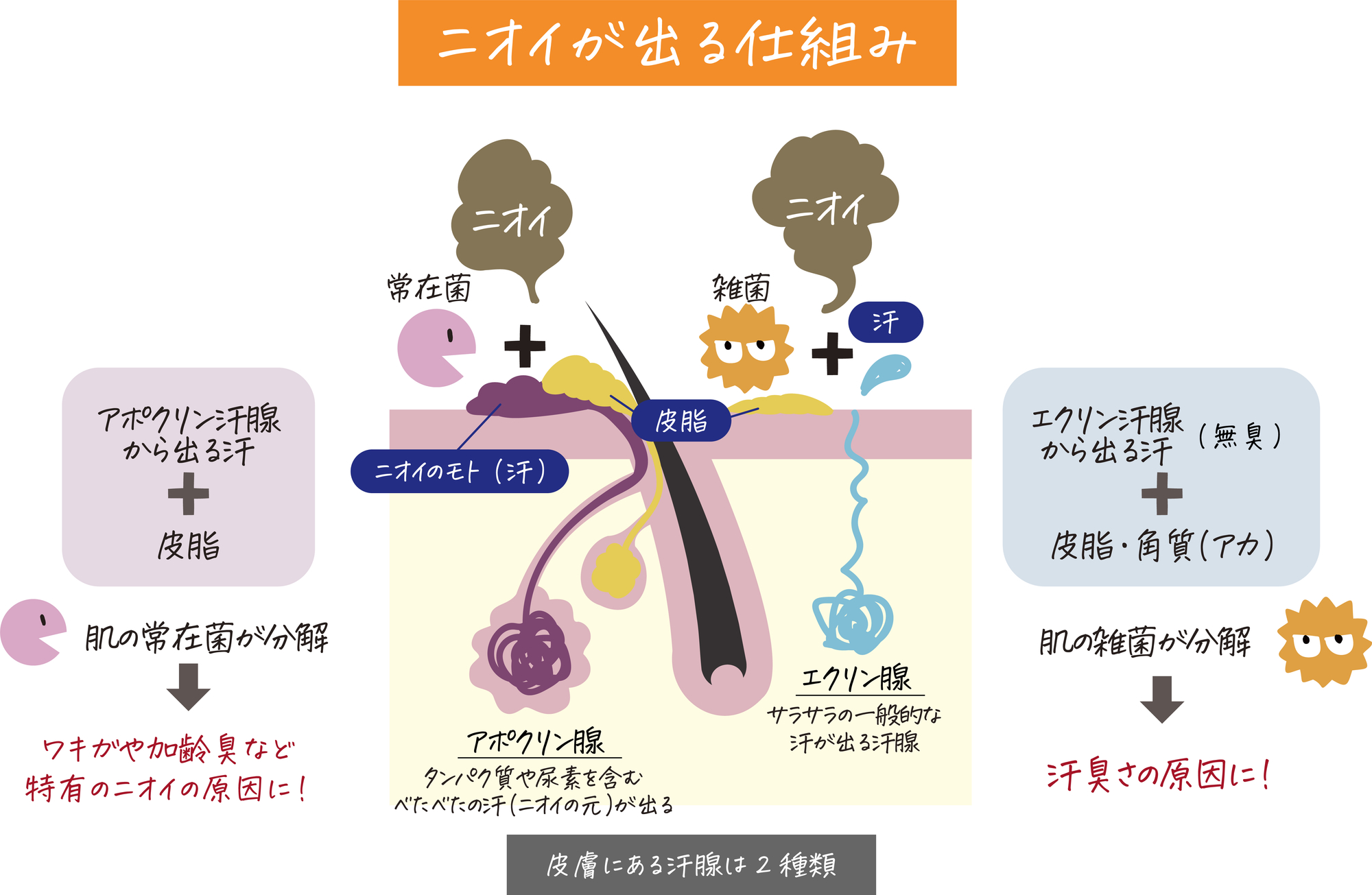 実はこのアポクリン腺の汗自体には、出たばかりのときはニオイがありません。ですが、皮膚の表面にいる常在菌がその汗を分解することで、特有のニオイが発生します。これが「ワキガ」と呼ばれるニオイの正体です。