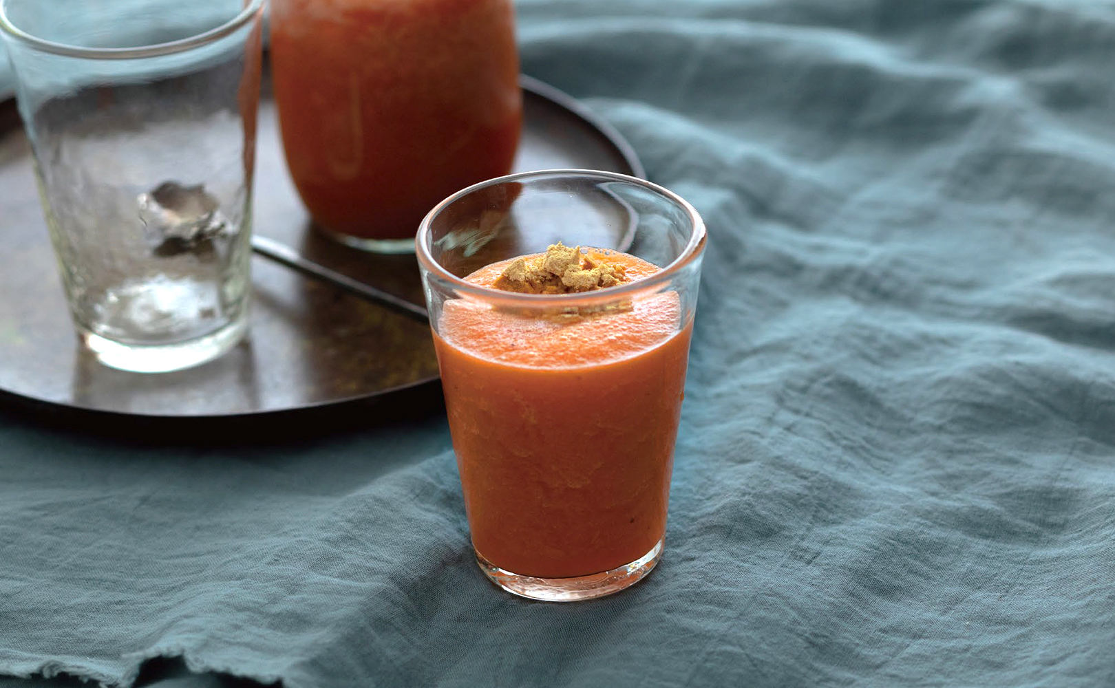 ニオイ対策食材の人参とセロリにバナナを加えることで飲みやすくアレンジ。 さらに対策食材のきな粉をトッピングした栄養価も高い一杯です。
